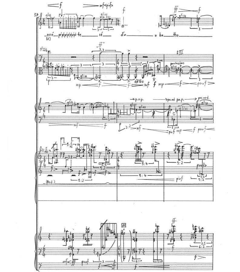 für Vokaltrio (STB), Altsaxophon, Baritonsaxophon und Schlagzeug [9 min]